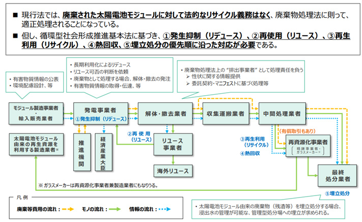 太陽光パネルの処分(適正処理・リサイクル)は、基本的には産業廃棄物として以下のような流れで行われています。
