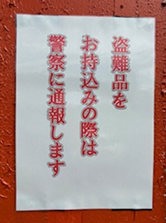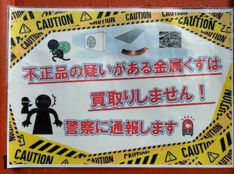 今回、通報協力いただいた金属くず買取事業者様の入口には次のような注意を掲載していただきました。